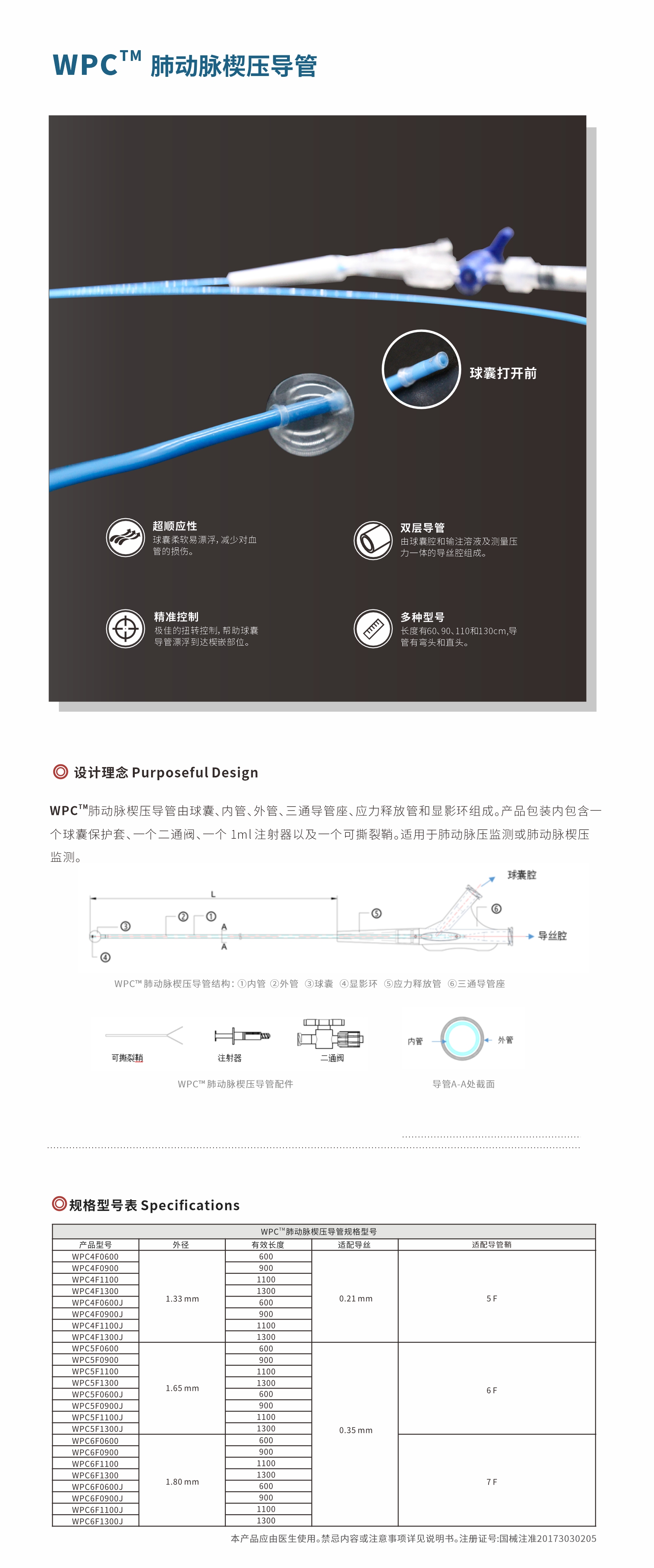 WPCTM肺动脉楔压导管由球囊、内管、外管、三通导管座、应力释放管和显影环组成。产品包装内包含一个球囊保护套、一个二通阀、一个 1ml 注射器以及一个可撕裂鞘。适用于肺动脉压监测或肺动脉楔压监测。